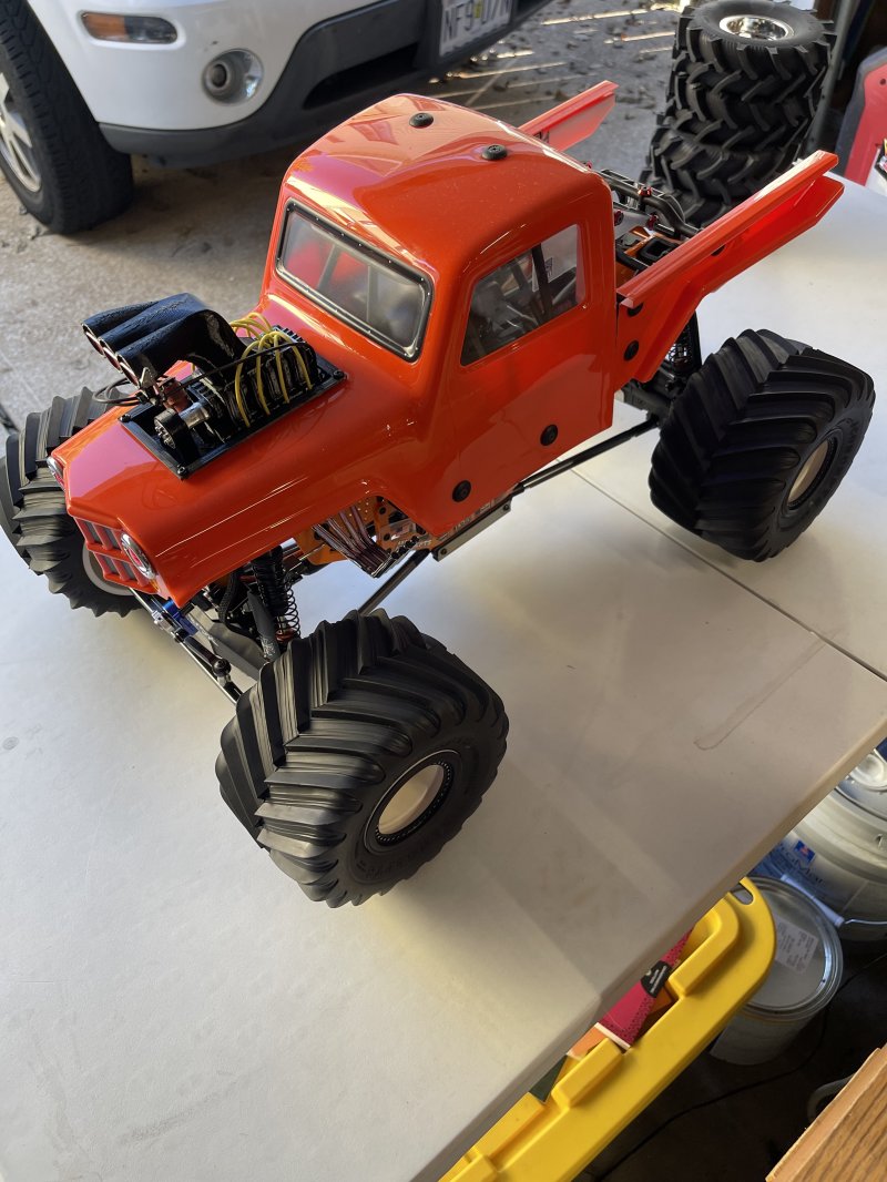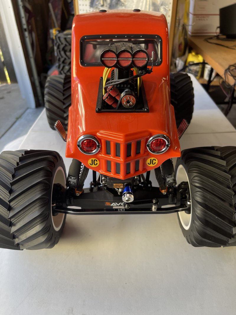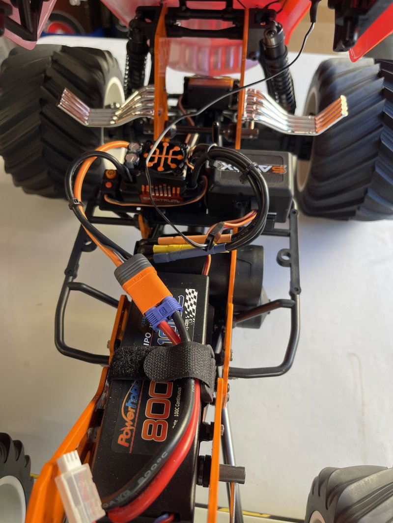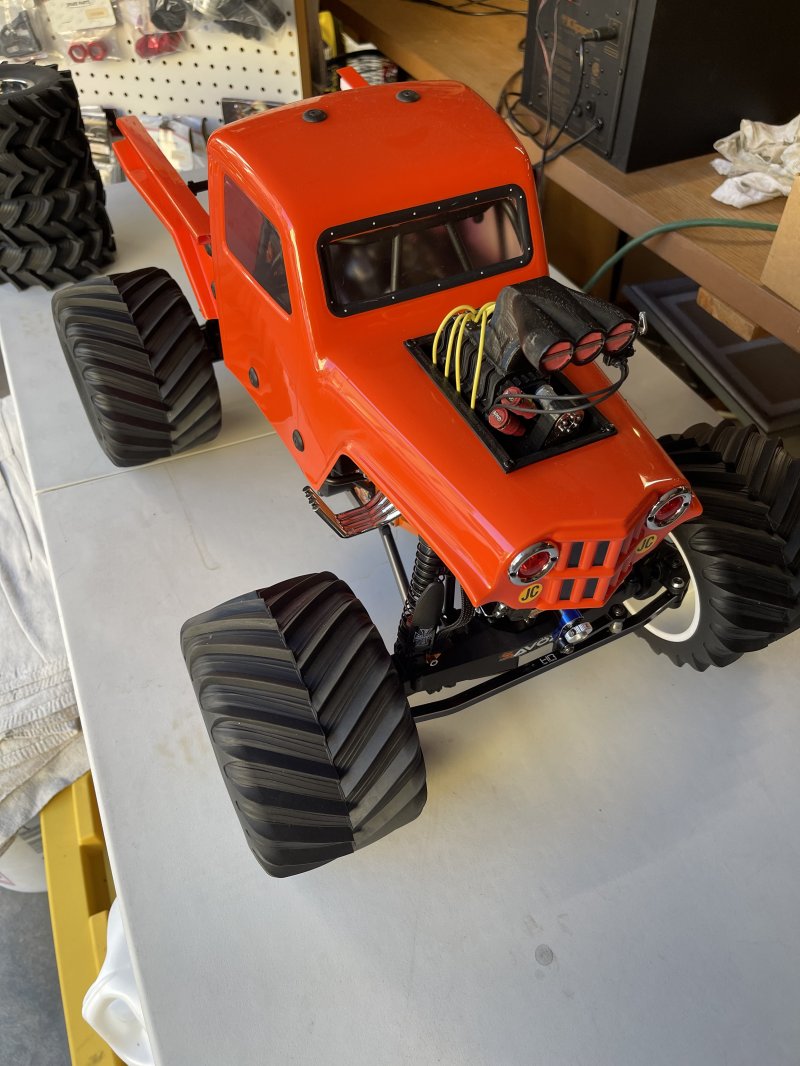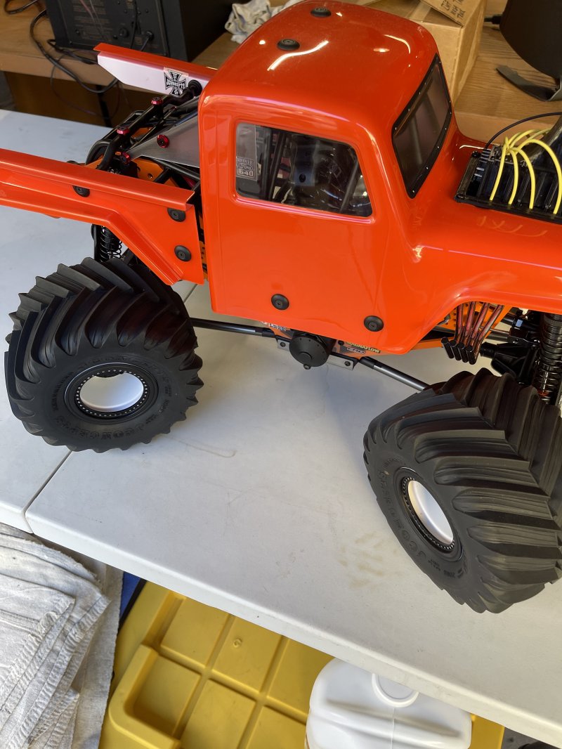Upgrades include rear steering, (2) Savox 1270 front and rear steering, 8000 7.4 lipo battery, 1/10 Demolisher F/R 2.6"/3.5" MT Tires Mounted 12mm Gray Wheels , stock tires include with various take off parts. All these upgrades run roughly $625 base price of Bog Hog $680 Stock specs: Officially Licensed: Designed to look and perform just like the real trucks Best Power-to-Weight Ratio: 4S-capable powerplant Overbuilt: 1/8 scale metal drivetrain in a 1/10 platform for extreme durability 1/8 LMT Mega Truck Bog Hog 4S 4X4 RTR Brushless Mega Truck, Orange Features Officially Licensed King Sling and Bog Hog Body Officially Licensed D&D Paddy Tire and Wheel Spektrum™ Firma™ 130A Brushless Smart ESC Spektrum™ Firma™ 3668 2800Kv WP Brushless 4-Pole Motor Spektrum DX3™ DSMR® Smart Transmitter Scale Solid-Axle Housing 1/8 Scale Metal Drive Train with CUSH Drive Powder-Coated Vertical Plate Chassis New Flip Top Cage Long Travel, Oil Filled, Coil-Over Shocks with New Shock Shafts Adjustable Servo Saver