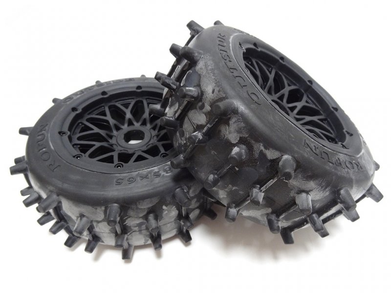 Rovan ROFUN Destroyer Baja Buggy Front Knobby Spike Tires on 20-Spoke Beadlock Rims Color: Black MPN: RV953221 185-65 Reinforced Spike/Knobby Tires pre-mounted 24mm metal Hex Best tire for maximum grip for running on grass Set of 2