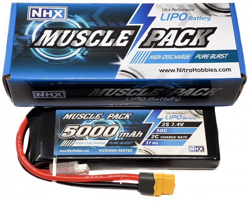 Key Features: Made of Premium-grade raw materials Ultrasonic welded hard wired leads Staked cell construction Ultra-Thin cell separator Low-resistance, high-reliability, and consistency High gauge wire with quality connectors Long cycle life with 150 times minimum, up to 230Wh/kg energy density Premium grade battery at low price!!! Go further and faster with NHX Muscle Pack Lipo Batteries. Built for reliable and consistent performance, NHX Lipo Batteries offers a long cycle life with 150 times minimum, up to 230Wh/kg energy density, and low internal resistance (IR) for more stable voltage output throughout the entire duration of your battery. Our lithium polymer batteries are made of premium-grade raw materials and constructed with ultrasonic welding to reliably deliver consistent power when you need it the most. Each battery comes with high gauge wires with quality connectors to give you that pure burst and performance that you can count on. Our batteries deliver full capacity & discharge as well as being the best value batteries in the hobby market! They are your ideal choices for the RC Cars, Trucks, Crawlers, Airplanes, Drones & Boats. Specifications: Voltage Rating: 2S -7.4V Rated Capacity: 5000mAh Discharge Rating: 50C continuous Discharge Lead Connectors: 12AWG (145mm / 5.7 in Length ) Wires, XT60 Connector Balancing Connector: JST-XH with AB Clip Watt Hours: 37 Wh Dimensions: Length: 138mm (5.43 in.) Width: 46mm (1.81 in.) Height: 25mm (.98 in.) Weight: 266g (9.4 oz)