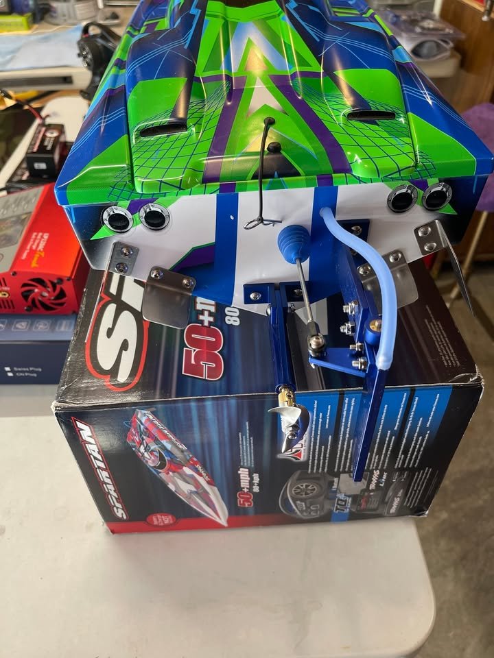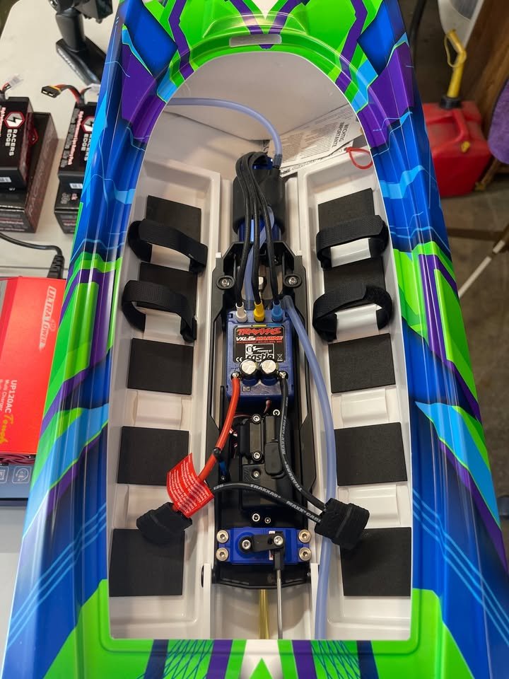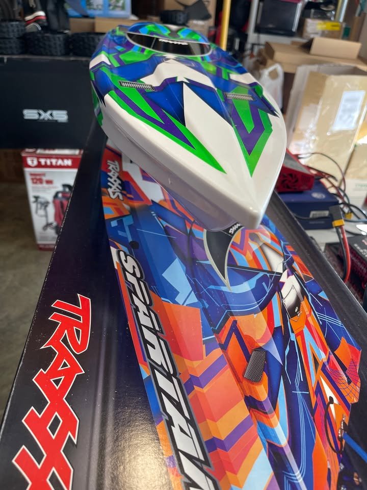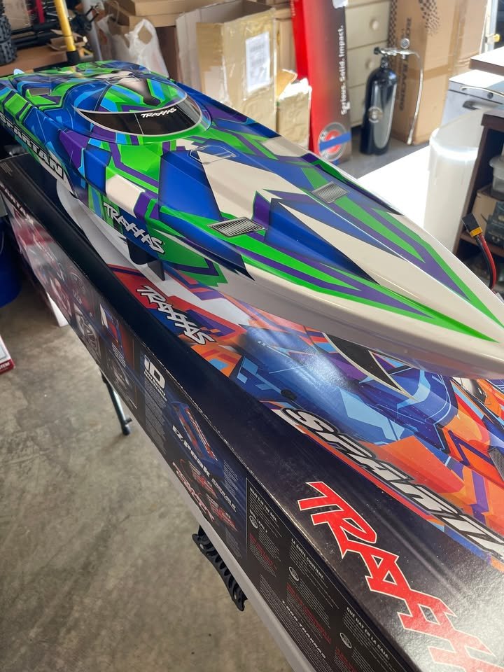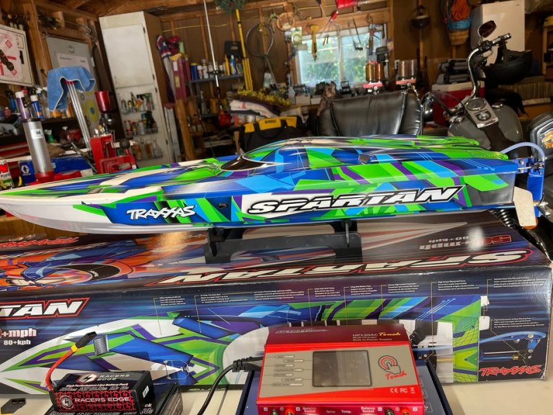 Entire package, Includes 2 lipo batteries, dual charger see all pics Traxxas Spartan™ Brushless Muscleboat! Spartan is the kind of boat you expect from Traxxas. Its 50+mph fury makes even the most insatiable, power-hungry enthusiasts jump up and take notice. Spartan means business with its super-rigid, 36-inch deep-V hull, smooth, cable-drive efficiency, innovative water cooling system, and precision aluminum and stainless steel drive controls. The clean, modern hull design is built up in layers for maximum rigidity and its bold paint makes a statement on the water. The integrated battery trays secure a wide variety of battery packs from 8.4V NiMH batteries all the way up to 8400mAh 3s LiPo packs. A high-output TQi 2.4GHz radio with the innovative Traxxas Stability Management (TSM) system keeps Spartan under complete control as it slices through the water. Spartan delivers the power, speed, convenience, and fun for which Traxxas" award-winning cars and trucks are known. Prepare yourself for the ultimate RC boating power trip, only from Traxxas. Spartan is fully assembled with a TQi™ 2.4GHz radio system, Velineon brushless power system, applied graphics, and detailed instructions. Traxxas backs the Spartan and all of our products with industry-leading support that is second to none. A staff of skilled representatives is on-hand to answer your questions via phone, website, or e-mail. Unmatched parts support allows Spartan to be serviced with parts and support from thousands of hobby dealers worldwide. Traxxas goes the extra mile to ensure that your RC experience is fun, easy, and fast! Product Details: 35+mph with two 7.4V LiPo packs, 50+mph on 6s LiPo all-out! (batteries sold separately) Sleek 36" deep-V hull for stable high-speed performance Water-cooled, waterproof VXL-6s marine speed control Velineon 540XL high-output brushless motor with high flow water-cooling jacket TQi 2.4GHz radio system with Traxxas Stability Management® Quick-release Power Module integrates power system, waterproof electronics, and stuffing tube Blue-anodized aluminum rudder support, rudder, and drive strut Stainless steel turn fins, trim tabs, and hardware Product Specs: Hull Type: Deep-V Dead Rise Angle: 26 Degrees Hull Length: 36.5 Inches (927mm) Overall Length: 40.8 (1037mm) Overall Height: 5.8 (147mm) Beam (width): 9.5 Inches (243mm) Weight: 72oz (2041g) Speed Control Type: Traxxas Velineon® VXL-6s, Water-cooled Input Voltage: 7-18 NiMH Cells, 4-6 LiPo Cells (8.4-22.2 Volts DC) BEC Voltage: 6.0 VDC BEC Current: 3A Thermal Protection: Thermal shutdown Low Voltage Detection: Yes (user enabled) Motor (electric): Traxxas Velineon® 540XL Brushless, water-cooled Drive System: Direct Drive, 0.150" Flex Cable Outdrive: Adjustable Aluminum Prop: 2-blade composite, 42x59mm Transmitter: TQi 2.4GHz (2-channel) Receiver: 6533 2.4GHz Traxxas Stability Management® 5-channel Servo: 2056 High-torque waterproof Skill Level: 2