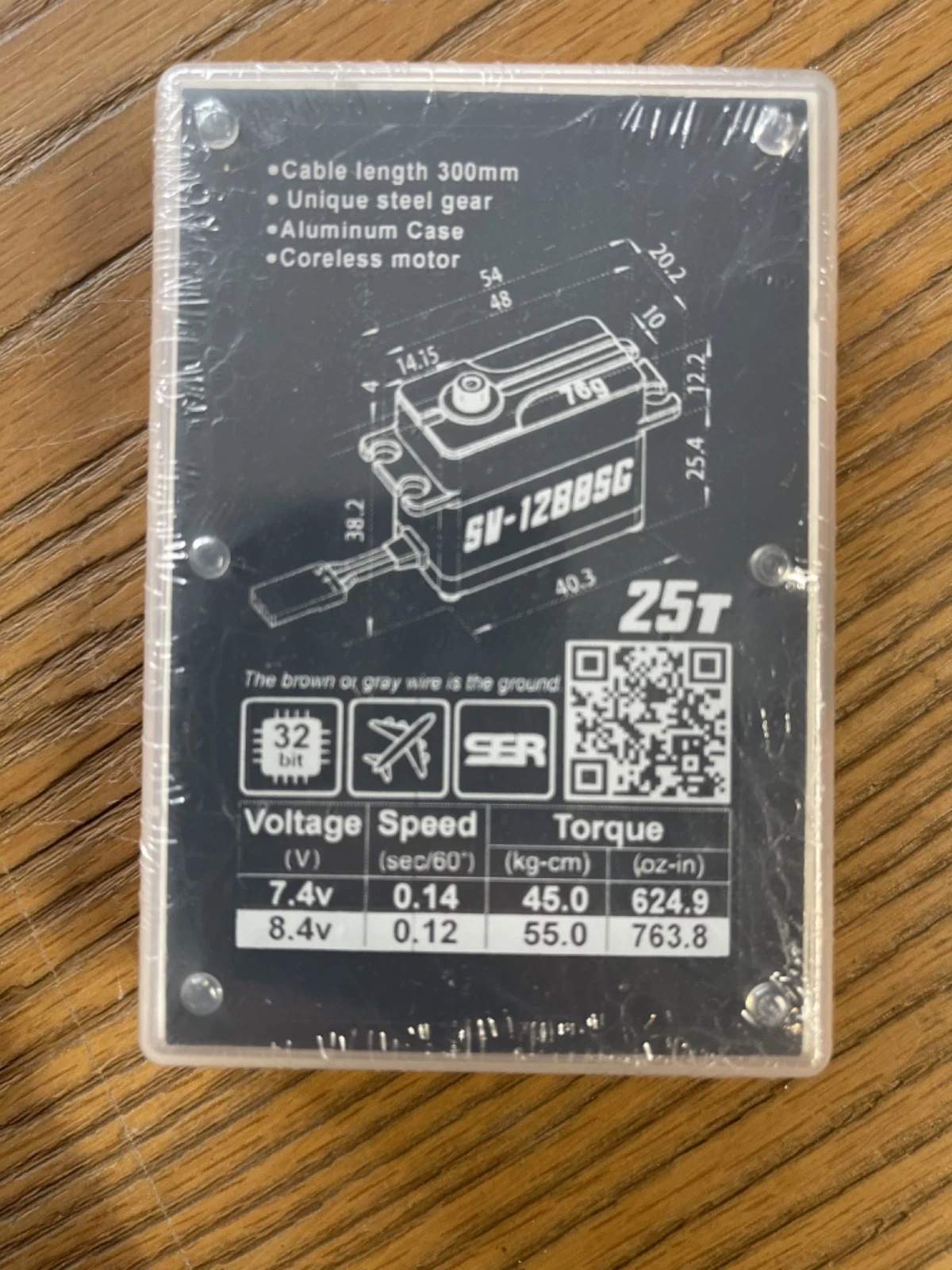 SAVSV1280SGP High Voltage Coreless Steel Gear Monster Torque Servo with Soft Start, 0.12sec / 763.8oz @ 8.4V "Plus" models feature Soft Start and Sanwa SSR Compatibility Features: Super strong and precision made unique steel gears provide durability and survive heavy use. Capable of HV operation. Fast and high torque for numerous applications. All aluminum case for heavy duty applications. Ideal for large scale aircraft, 1/8 off road, and other off road vehicles. Soft Start and Sanwa SSR Compatibility Specifications: Torque @ 7.4V - 45.0kg/624.9oz-in Torque @ 8.4V - 55.0kg/763.8oz-in Speed @ 7.4V - 0.14 sec/60 deg Speed @ 8.4V - 0.12 sec/60 deg Dimensions L x W x H (mm): 40.3 x 20.2 x 38.2 Weight: 76.0g