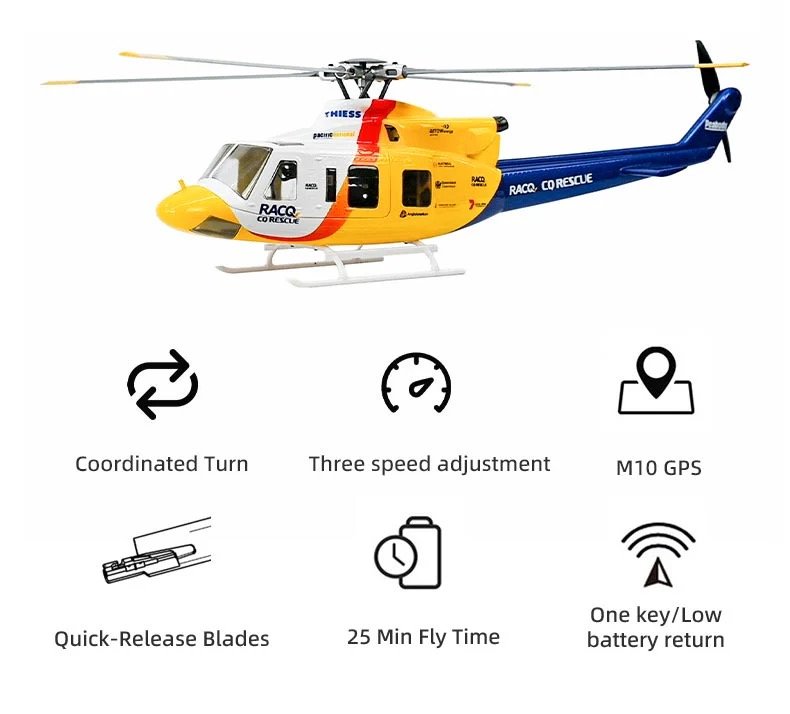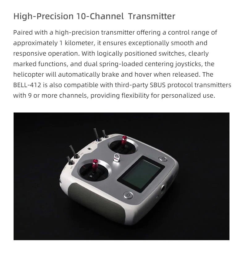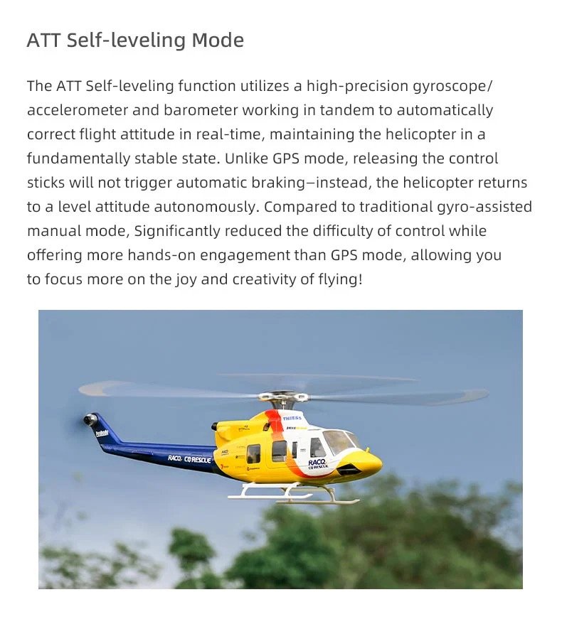 Fly Wing Bell-412 ACE Version 6CH GPS ATT Hovering Auto Return RC RTF Helicopter New ACE version Specification Hign-concerned Chemical None Is Electric Lithium Battery Anti-wind Ability 5 class Drone Weight 1.3kg Takeoff Weight 1.3kg Transit Time (Days) 1KM Model Number Bell 412 Controller Mode MODE1, MODE2 Flight Time 10~20 Control Channels 10 CHANNELS Controller Battery AA Is Batteries Included Yes Motor Brushless Motor Warning See User Manual Dimensions 80X23.5X15 CM Remote Distance 1km State of Assembly Ready-to-Go Remote Control Yes Package Includes Original Box, Batteries, Operating Instructions, Charger, Remote Controller, USB Cable Material Metal, Resin, Fiberglass, Carbon Fiber Brand Fly wing Flight mode GPS mode, ATT mode, Lose control return, Low voltage return, semi-automatic assisted flight Motor 3508 brushless motor Satellite positioning module GPS/GLONASS/Galileo Feature 1 Flight duration of 20 minutes Feature 2 Safety features Feature 3 Automatic assisted flight Feature 4 Stable hovering Feature 5 Efficient gear configuration Feature 6 Advanced satellites positioning modules