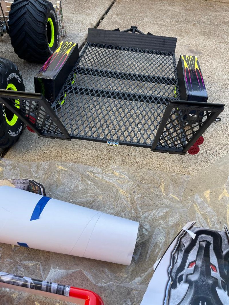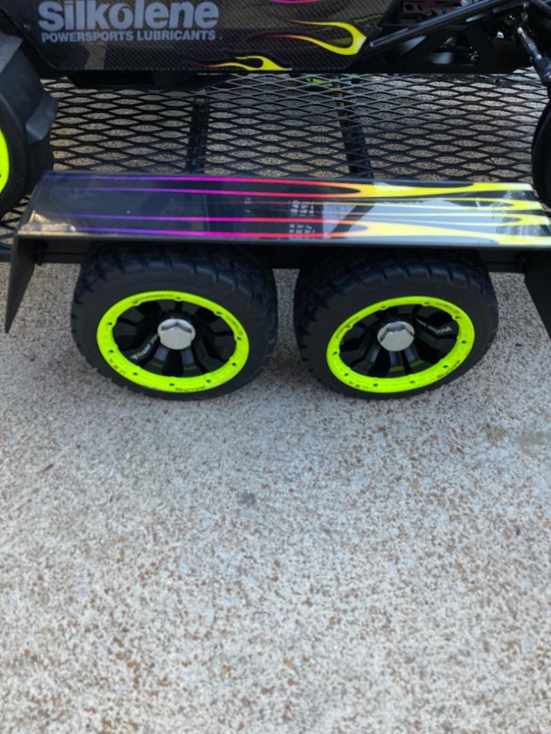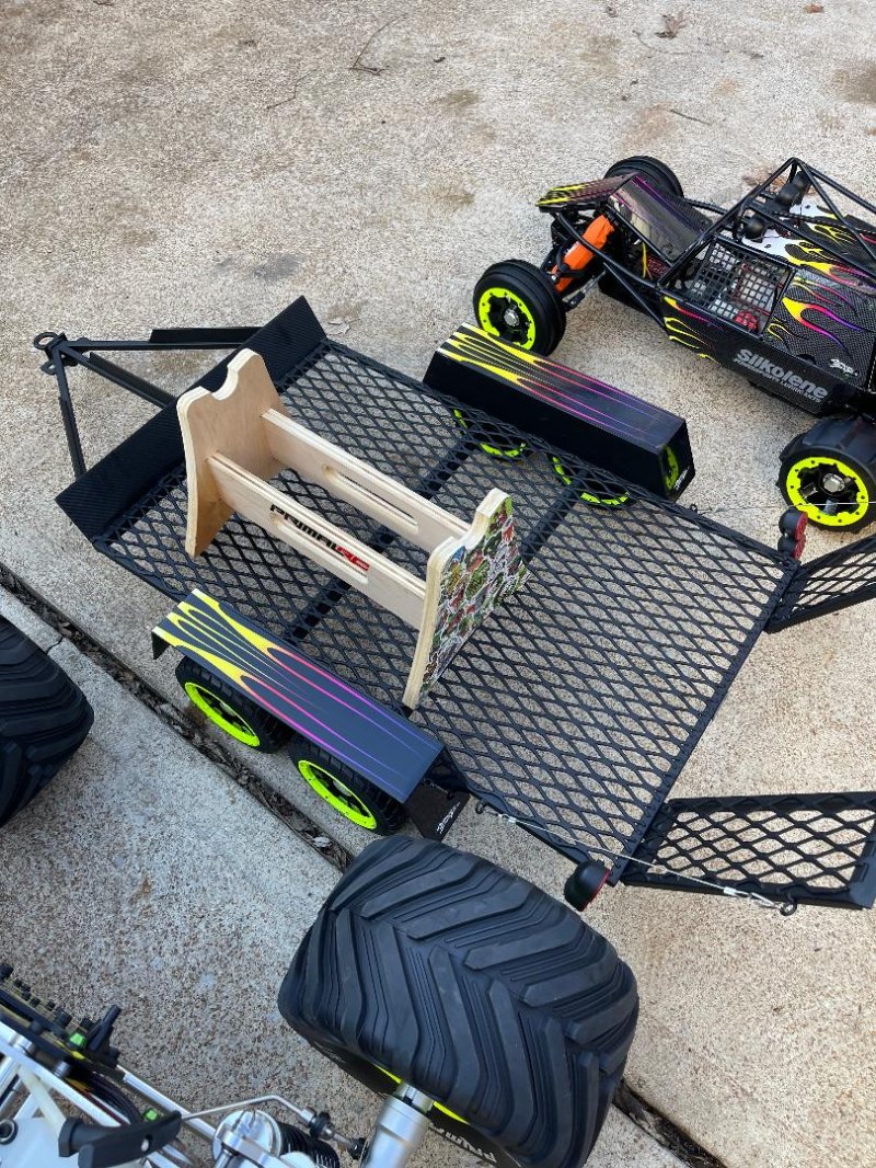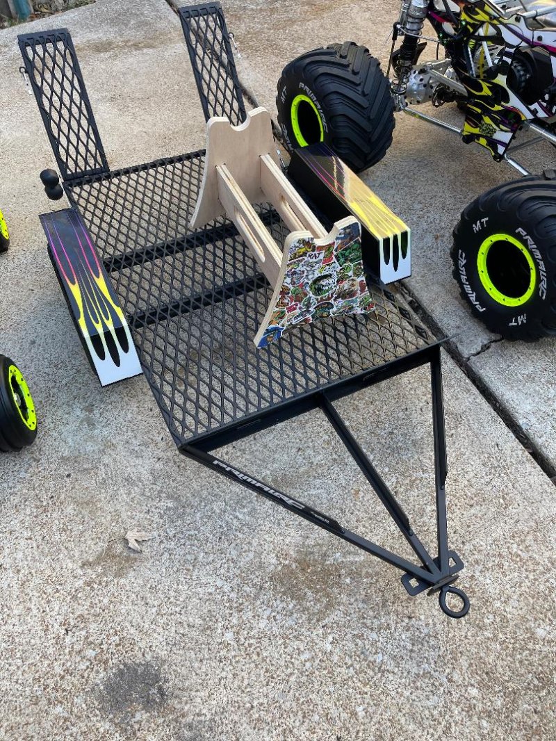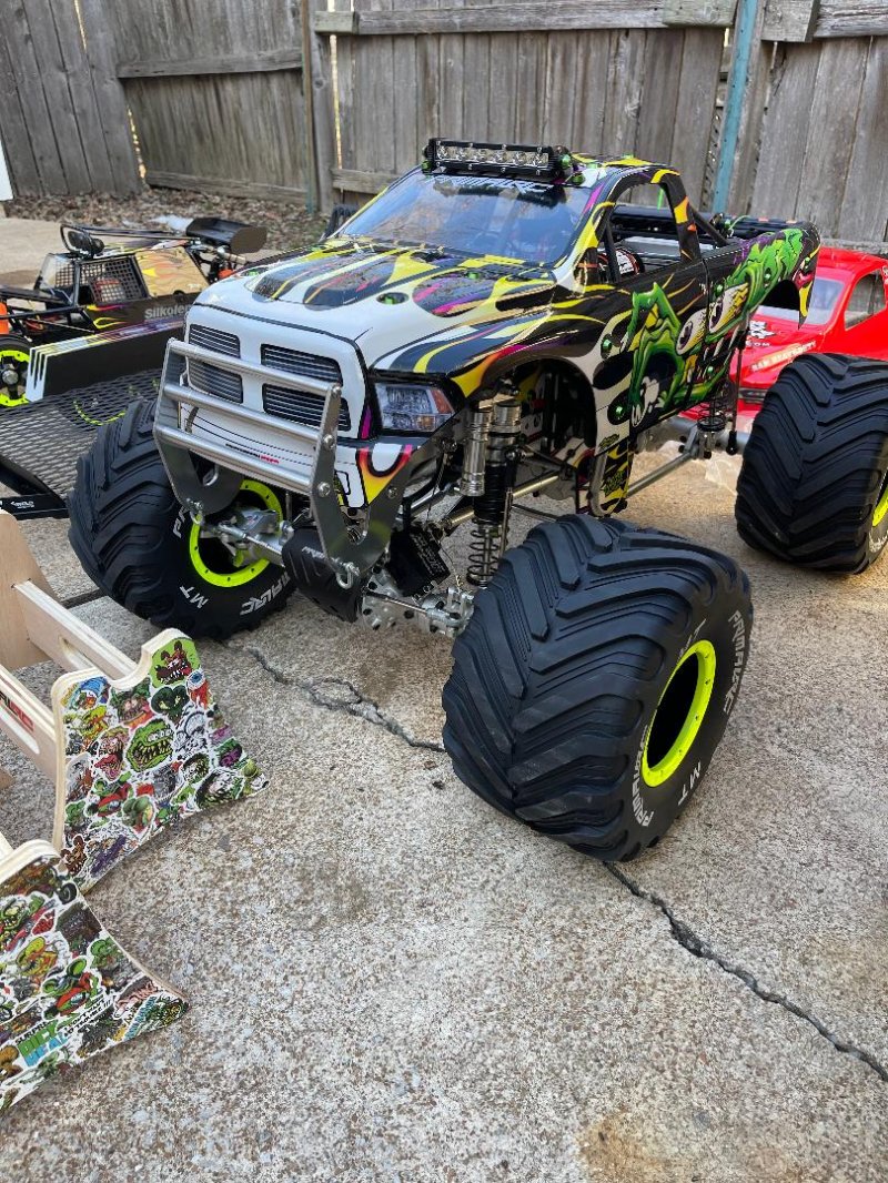 New custom Primal RC Raminator V3 49cc stock gasoline 2-stroke engine, never been run or had fuel in tank. Darkside studios wrap, Light bars front and rear see pics, Lights in body on its own lipo battery, Chrome push bar bumper. Matching stands, Many upgrades throughout shock oil reservoir, extra body, extra parts & premix fuel 2 bottles. Matching built from the ground up custom trailer w/ fully functioning ramps. Rovan 36cc sand rail buggy is optional or add $700 and shown for detail. I am located in St. Louis Missouri for pickup, bring a truck these are huge and truck alone is 85lb. Can meet within 50 mile radius. Call text or email 314-256-nine nine eight seven. or will5006@sbcglobal.net SPECIFICATIONS Features Feature Description Skill Level Advanced Speed 20 to 30 MPH Engine 49cc 2-Stroke Reed-valve Engine Transmission Single Speed with Remote Reverse Feature Differential Type Front and Rear Bevel Gear Differential Brake Front & Rear Single Disc Mounted Driveshaft Mounted Manual Disc Brakes Drive System All Steel Gears with double chain transfer case drive Steering Steering Dual Servo with HD Aluminum Servo Saver Radio 2.4 GHz 6-Channel FlySky Digital Radio Specifications Spec Description Length 40 inches Width 32 inches Height 24 inches Weight 80 pounds Wheelbase 24 inches Tires 12 x 7.5 inches Rims 5.5 in diameter x 6 inches wide Minimum Ground Clearance 4 inches, Adjustable Minimum Chassis Clearance: 4.5 inches, Adjustable Minimum Axle Ground Clearance 4 inches Tracks 31.5 inches Servos 2x 20kg Throttle/Reverse Servos 2x 100kg Steering Servos 1x 70kg Brake Servo Battery Type 7.2v 4800 mAh NiMH Battery TRIED AND TRUE DESIGN This is version 3 of the Primal RC Monster Truck platform Solid Axle Ready-To-Run Monster Truck 2-Stroke Reed-Valve 49cc Gas Mini Motorcycle Engine 78mm Centrifugal Clutch Transmitter-Activated Reverse Function Four-Link Coil-Over-Shock Suspension Setup Weighs A Backbreaking 80 Pounds 32 inches wide, 40 inches long and 24 inches tall Largest in-production tires designed for RC Solid Axle CNC aluminum axle tubes with steel axle shafts. Heavy duty CNC aluminum-cased oil-filled 4 bevel gear differentials. Steel ring and pinon gears. Modular axle tube designed for easy maintenance. Ready for rear-wheel steering conversion kit. NEW VERSION 3 EDITION With the latest version of the Raminator Monster Truck, we've introduced upgrades to the platform based on customer feedback. Upgraded 100KG steering servos, upgraded large capacity MEGA shocks, upgraded aluminum electronics box with voltage meter, and an upgraded and redesigned reverse gear slider are just some of the upgrades we've added to this model.