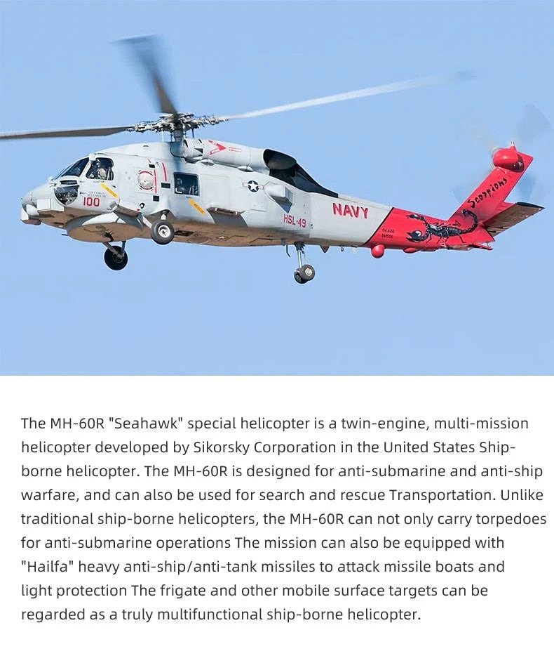 The MH-60R Seahawk features a helicopter-like landing gear and a simulated four-blade metal propeller The rotor head and horizontal tail enhance the balance effect of flight, while the transparent cockpit cover ensures a high level of The restored paint makes the entire machine appear more authentic.