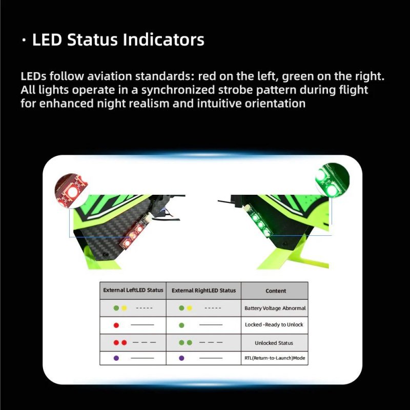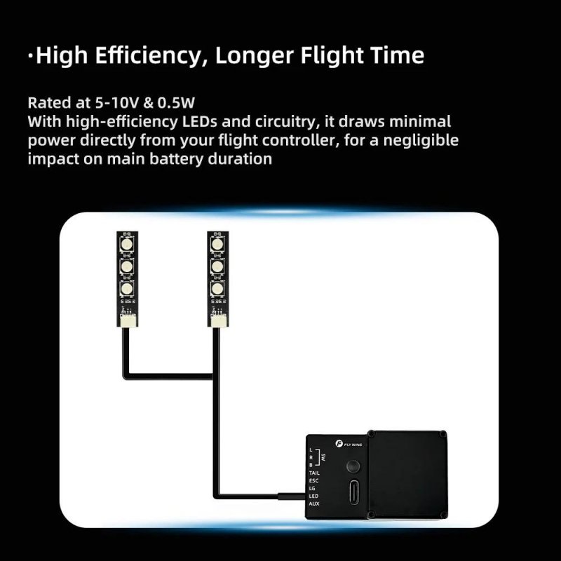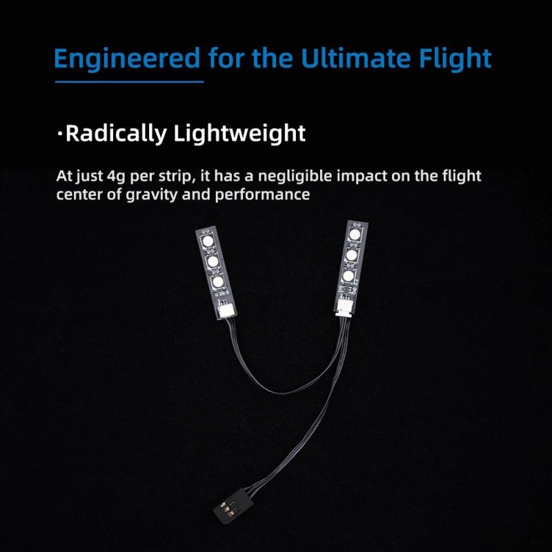ONLY for ACE FW450L Conquer the Dark ยท Define Every Flight COOL REAL SAFE EASY Engineered for the Ultimate Flight Transform your fixed-wing aircraft into a stunning night-time spectacle with our professional-grade FW450L LED lighting system. Designed specifically for RC enthusiasts who demand authenticity and performance, this lighting kit brings your aircraft to life whilst maintaining optimal flight characteristics. Radically Lightweight At just 4g per strip, our LED lighting system has a negligible impact on the flight centre of gravity and performance. Fly with confidence knowing your aircraft's handling remains pristine whilst enjoying brilliant illumination. High Efficiency, Longer Flight Time Rated at 5-10V & 0.5W With high-efficiency LEDs and circuitry, the system draws minimal power directly from your flight controller, ensuring a negligible impact on main battery duration. Enjoy extended flight sessions without compromise. LED Status Indicators Our LEDs follow aviation standards: red on the left, green on the right. All lights operate in a synchronised strobe pattern during flight for enhanced night realism and intuitive orientation. Intelligent Status System External Left LED Status External Right LED Status Content Green + Yellow Green + Yellow Battery Voltage Abnormal Red Green Locked - Ready to Unlock Red + Red Green + Green Unlocked Status Purple Purple RTL (Return-to-Launch) Mode Direct Flight Controller Integration The FW450L connects directly to your flight controller's LED port, with dedicated connections for Left (L), Right (R), Battery (B), Tail, ESC, Landing Gear (LG), LED, and Auxiliary (AUX) functions. This comprehensive integration ensures seamless operation and intelligent status feedback. Key Benefits Aviation-standard navigation lights for authentic fixed-wing appearance Ultra-lightweight design at only 4g per strip maintains perfect flight characteristics Minimal power consumption for extended flight times Direct connection to flight controller for seamless integration Comprehensive port connections for full aircraft lighting control Intelligent status indicators for enhanced safety Synchronised strobe pattern for superior visibility Professional-grade build quality Easy installation process Technical Specifications Operating Voltage: 5-10V DC Power Consumption: 0.5W Weight: 4g per strip LED Configuration: Red (left), Green (right) Operating Mode: Synchronised strobe pattern Connection Ports: L, R, B, TAIL, ESC, LG, LED, AUX Connection: Direct to flight controller What's Included FW450L LED light strips (red and green) Flight controller interface module Connection cables Installation accessories User manual Compatibility Compatible with most modern flight controllers featuring LED output ports and multi-function connections. Suitable for fixed-wing aircraft of various sizes. Please verify your flight controller specifications before purchase. Installation Simple plug-and-play installation. Connect directly to your flight controller's LED port and additional function ports as needed. Detailed installation instructions included. No soldering required for most setups.