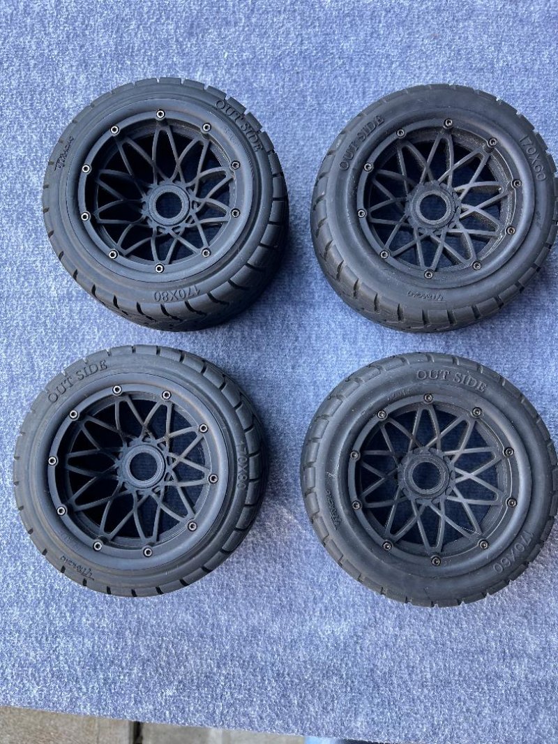 Rovan Baja Full Set of ON Road Slab Stone Racing Tires on Rims (New 20 Spoke Style) MPN:854971 Mounted on 20 spoke HD rims with 24mm metal hex Includes 2 rear (170x80mm) and 2 fronts (170x80mm) New Anti-growth mesh bonded to the inside of the tire for added strength Gives great traction on most on road surface’s Nice quality!! Fits HPI Baja 5B, 2.0 SS Rovan and King Motor Baja buggies. Great for the HPI Baja 5R Mustang