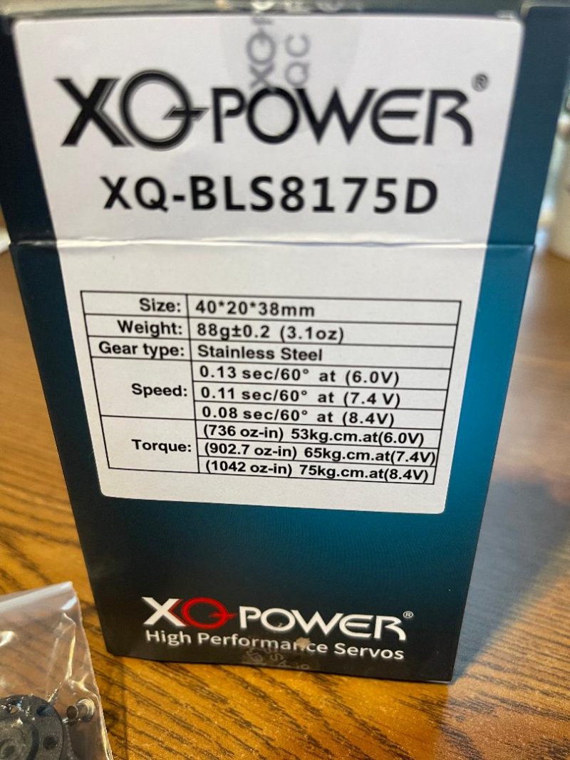 Size: 20*40*38mm Gear: Stainless steel gear Motor: Brushless motor Casing: CNC aluminum casing Weight: 88g (2.7oz) Speed/Torque/Voltage: 0.08 sec/60°, 75kg.cm(1042 oz.in) @8.4V 0.11 sec/60°, 65kg.cm (902.7 oz.in)@7.4V 0.13 sec/60°, 153kg.cm(736 oz.in)@6.0V